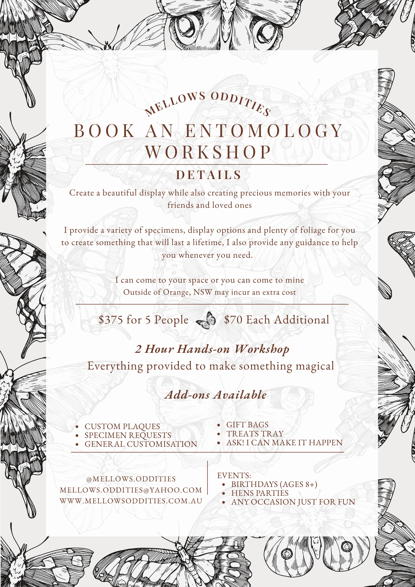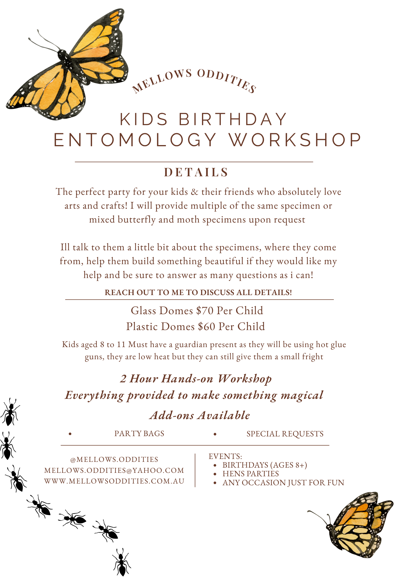 I now offer workshops for your special occasions! Kids parties to Hens nights or even just for fun, read below for more details & reach out to me for questions and adjustments